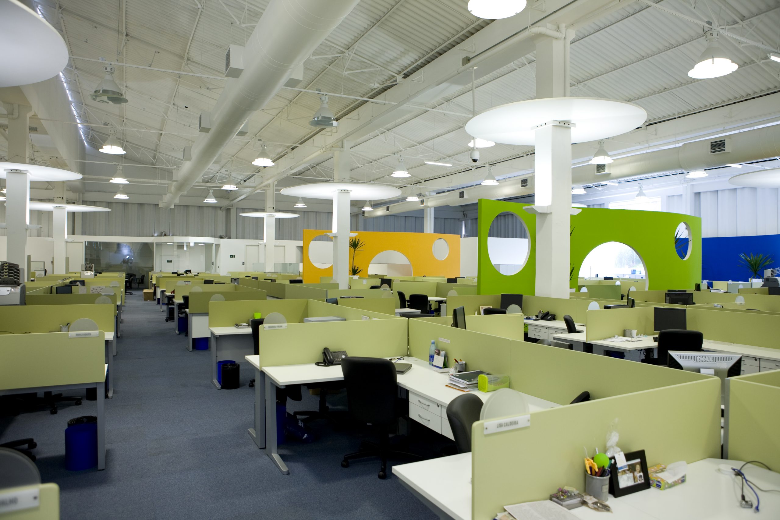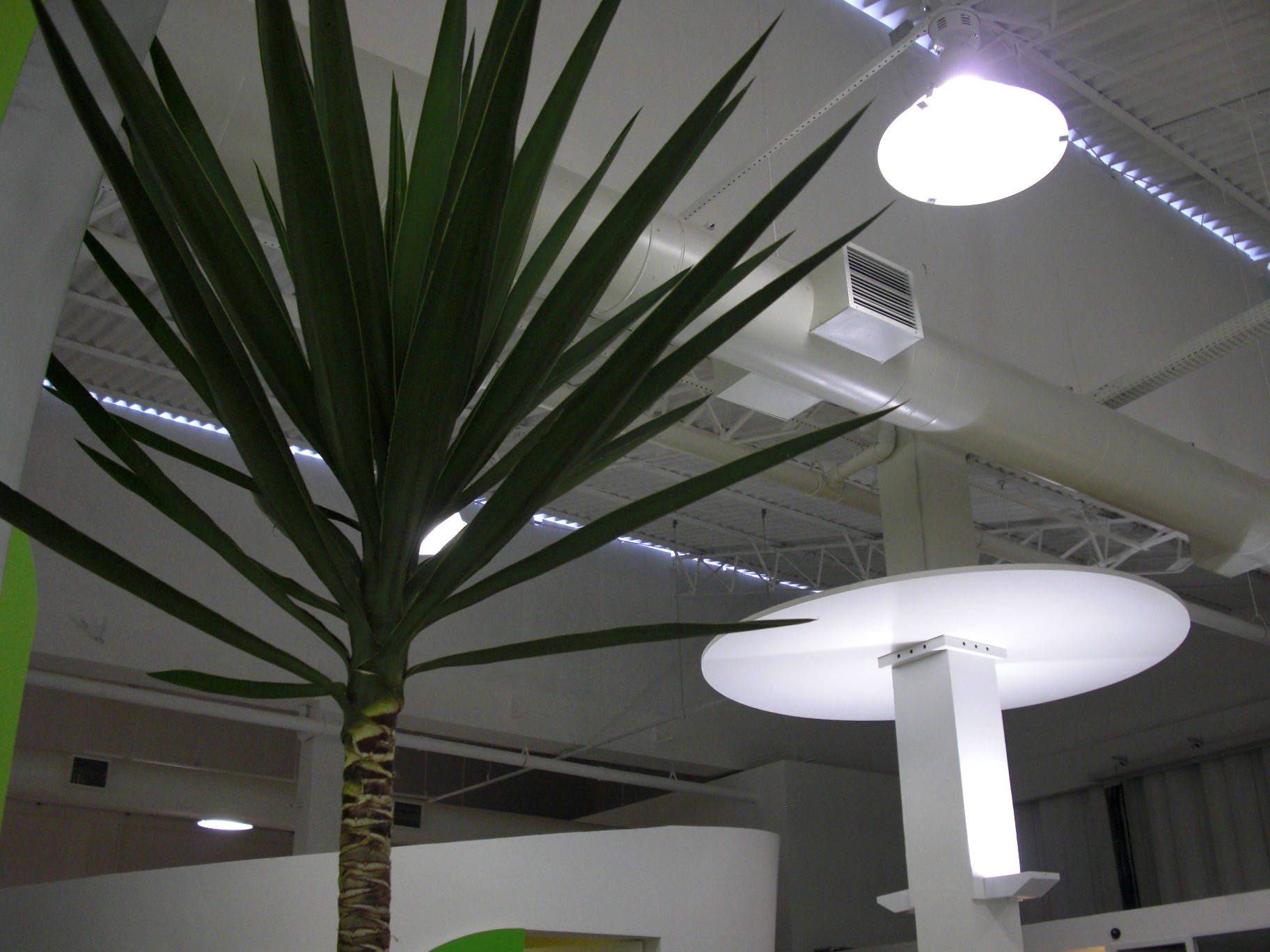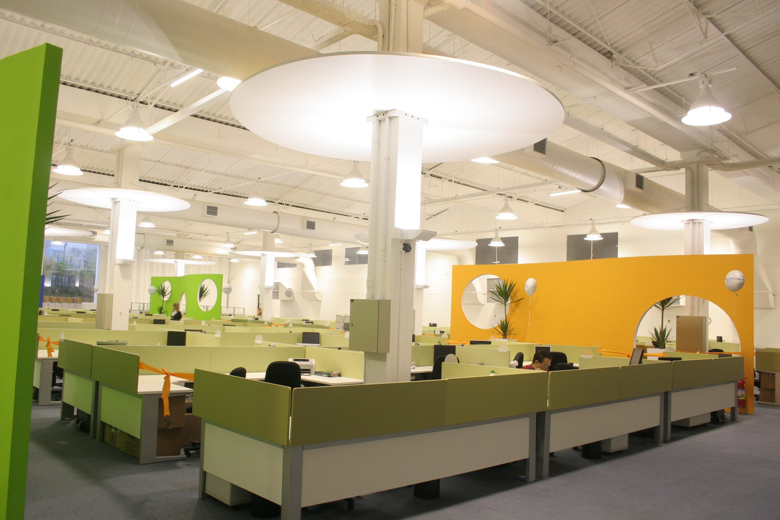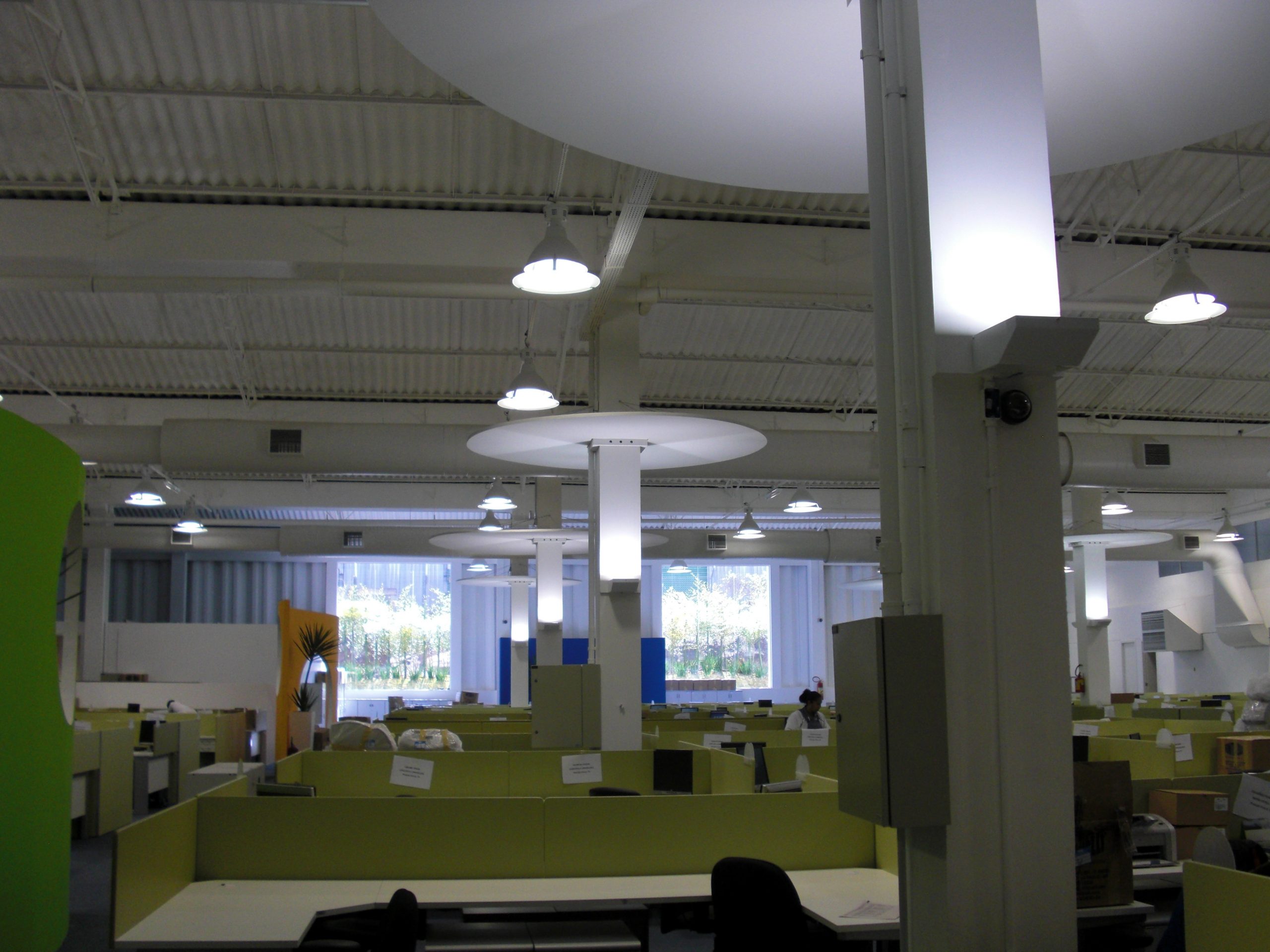 Para garantir a entrada de luz natural, abriram-se rasgos de janelas nas laterais e uma grande janela nos fundos do galpão, onde também foi feito um jardim que humanizou o espaço. Os sheds, característicos das antigas construções industriais. precisaram ser fechados com gesso porque se encontravam em Péssimo estado de conservação e uma reforma teria alto custo A iluminacão foi reforcada com rebatedores de luz instalados nos pilares estruturais a cada 9m. São elementos circulares executados em aglomerado e pintados de branco que recebem a luz de duas luminarias do tipo pá e a rebatem para Baixo.