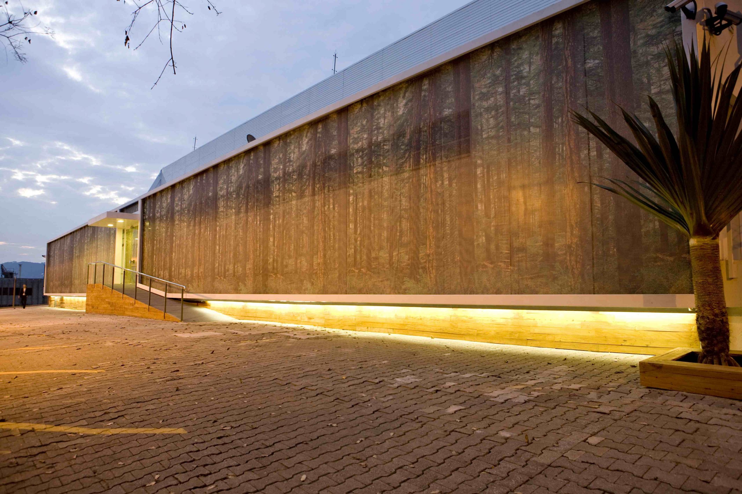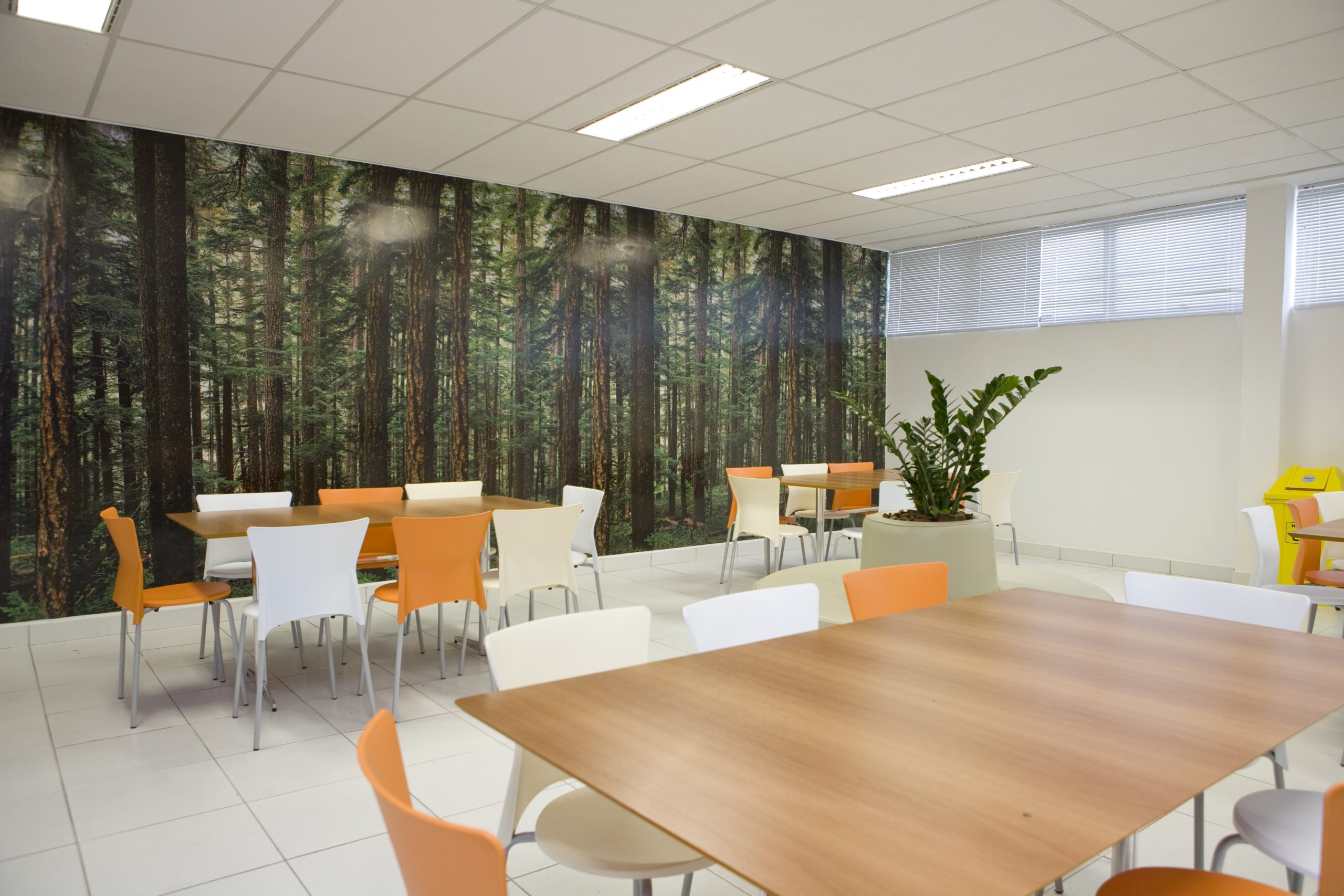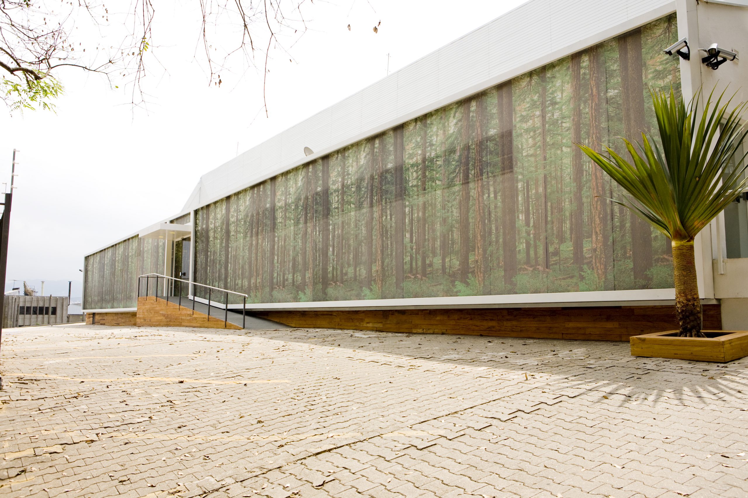 Em 120 dias de obra, o galpão de 3.800 mª ganhou nova roupagem desde a fachada. Para evitar a troca da caixilharia, a opção recaiu sobre um painel com uma foto de uma flo resta com árvores impressa em tela perfurada, semelhante ao entorno do terreno, dando a sensação visual de prosseguimento da vegetação A mesma imagem aparece no ambiente interno dos escritórios. Sob o painel da fachada de 45 m, uma moldura de madeira de demolição com iluminação completa o quadro de forma cenográfica. Internamente, a empresa recebeu ambientação contemporânea, com destaque para as inúmeras divisorias que delimitam os espaços de acordo com suas funções. Elas se destacam pelo formato curvo e variadas alturas – 2.80 m, 3 m. 4 m -, além das cores diferenciadas: larania, verde e azul, em tons que ja integram a comunicação visual da empresa.
