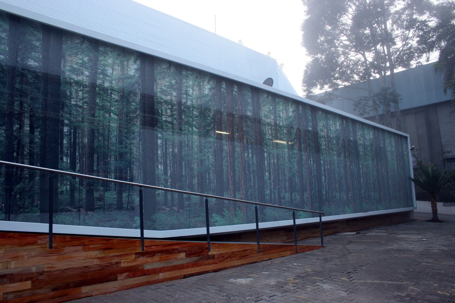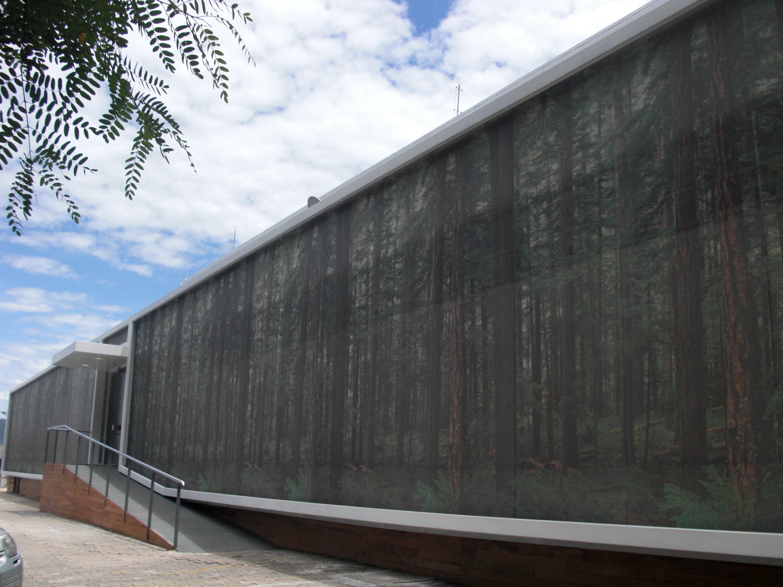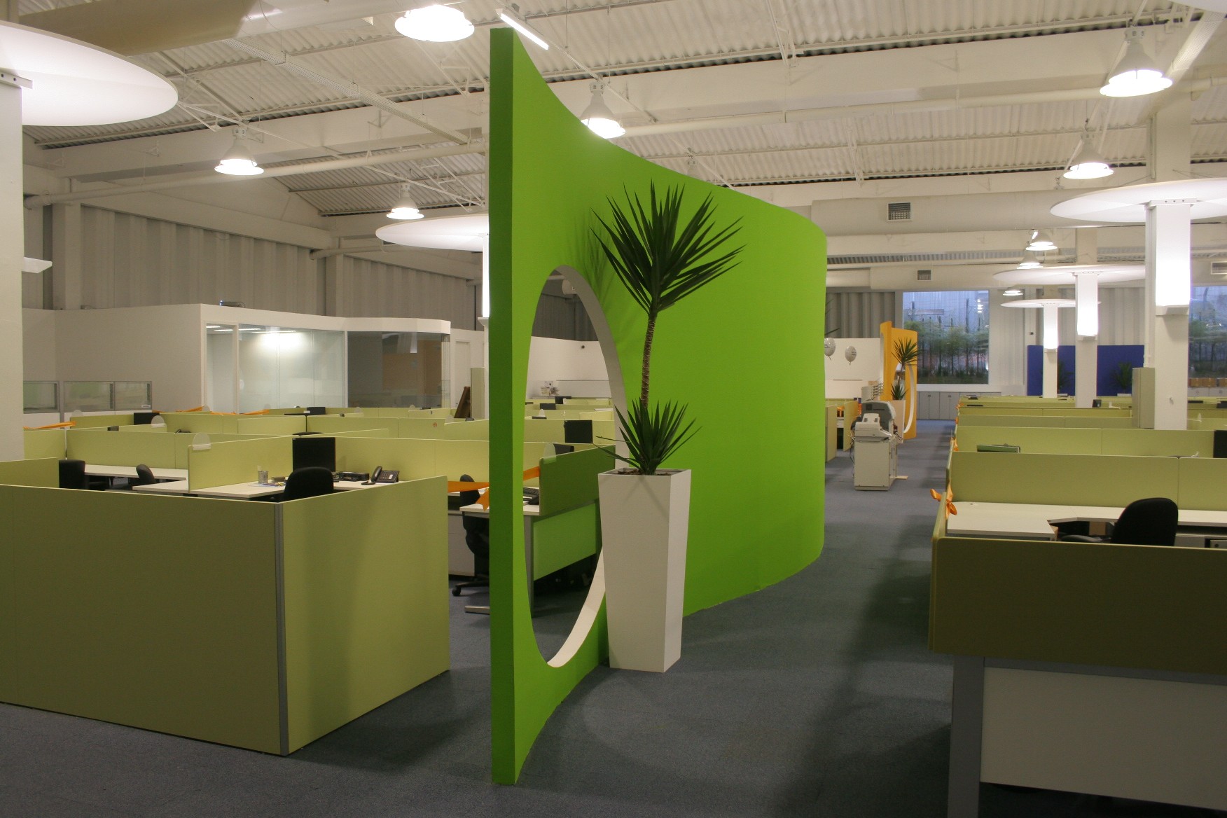 Em 120 dias de obra, o galpão de 3.800 mª ganhou nova roupagem desde a fachada. Para evitar a troca da caixilharia, a opção recaiu sobre um painel com uma foto de uma flo resta com árvores impressa em tela perfurada, semelhante ao entorno do terreno, dando a sensação visual de prosseguimento da vegetação A mesma imagem aparece no ambiente interno dos escritórios. Sob o painel da fachada de 45 m, uma moldura de madeira de demolição com iluminação completa o quadro de forma cenográfica. Internamente, a empresa recebeu ambientação contemporânea, com destaque para as inúmeras divisorias que delimitam os espaços de acordo com suas funções. Elas se destacam pelo formato curvo e variadas alturas – 2.80 m, 3 m. 4 m -, além das cores diferenciadas: larania, verde e azul, em tons que ja integram a comunicação visual da empresa.