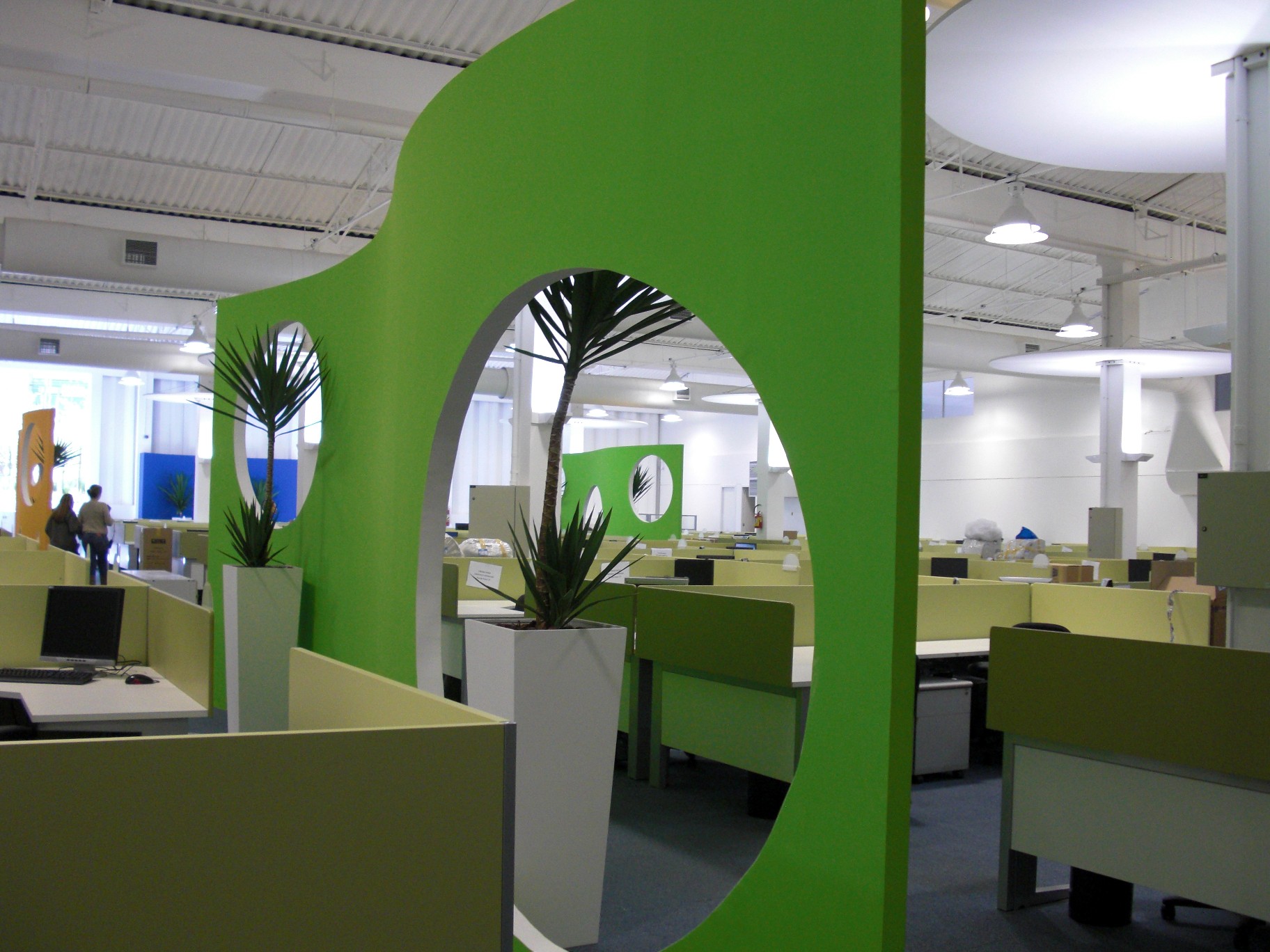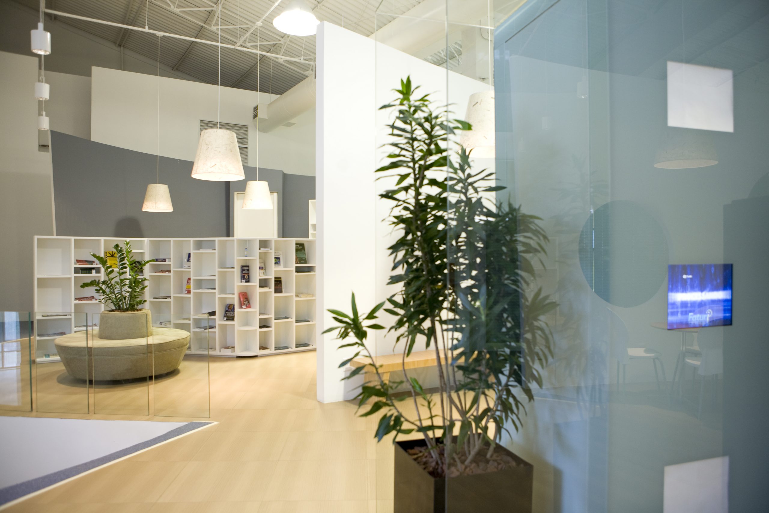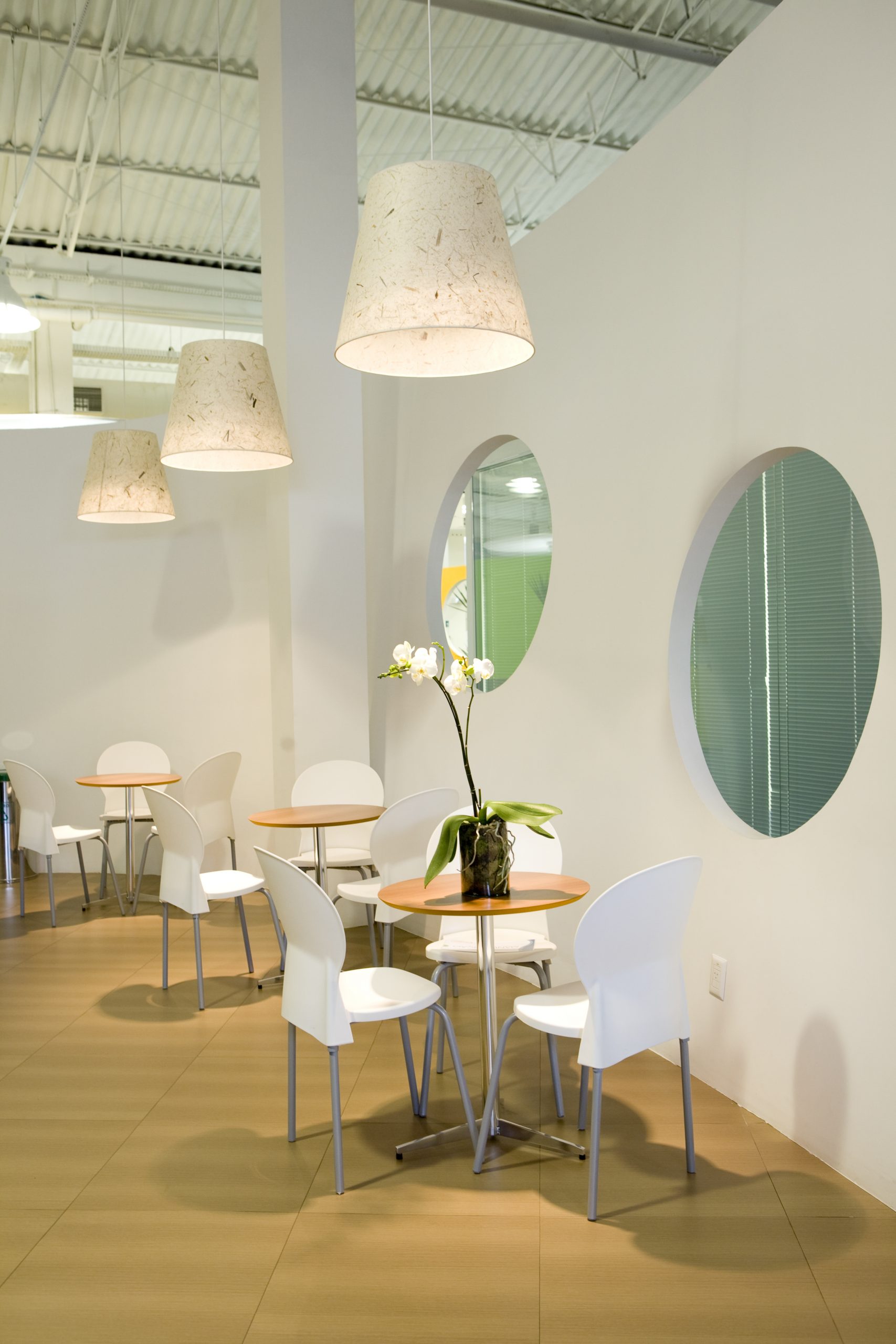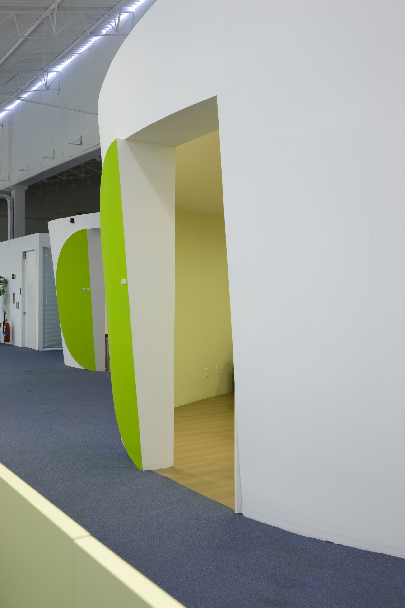 A partir dessas divisórias com estrutura metálica, revestimento em placas de gesso e recortes circulares no centro, os ambientes se sucedem – lounge, café, lanchonete, auditório, CPD. biblioteca, cybercafé, espera. O layout interno priorizou a chamada área dos colaboradores, que ocupa praticamente todo o espaço, tendo, numa das laterais, as salas de reunião e diretoria. Os corredores ganharam como que ilhas com divisorias curvilineas e arvores. uma forma de amenizar a rigidez do espaço de trabalho. Toda a madeira do mobilia rio é certicada com o selo verde. A sustentabilidade sempre presente nos projetos