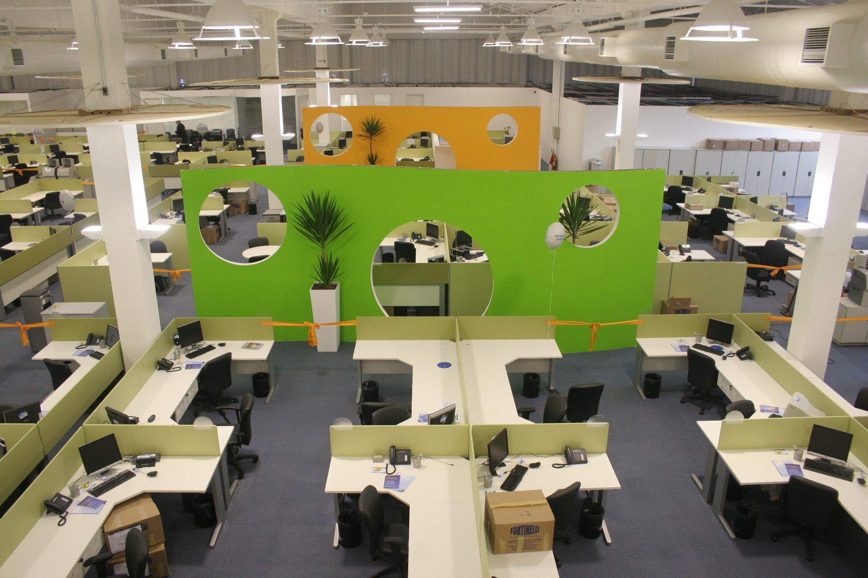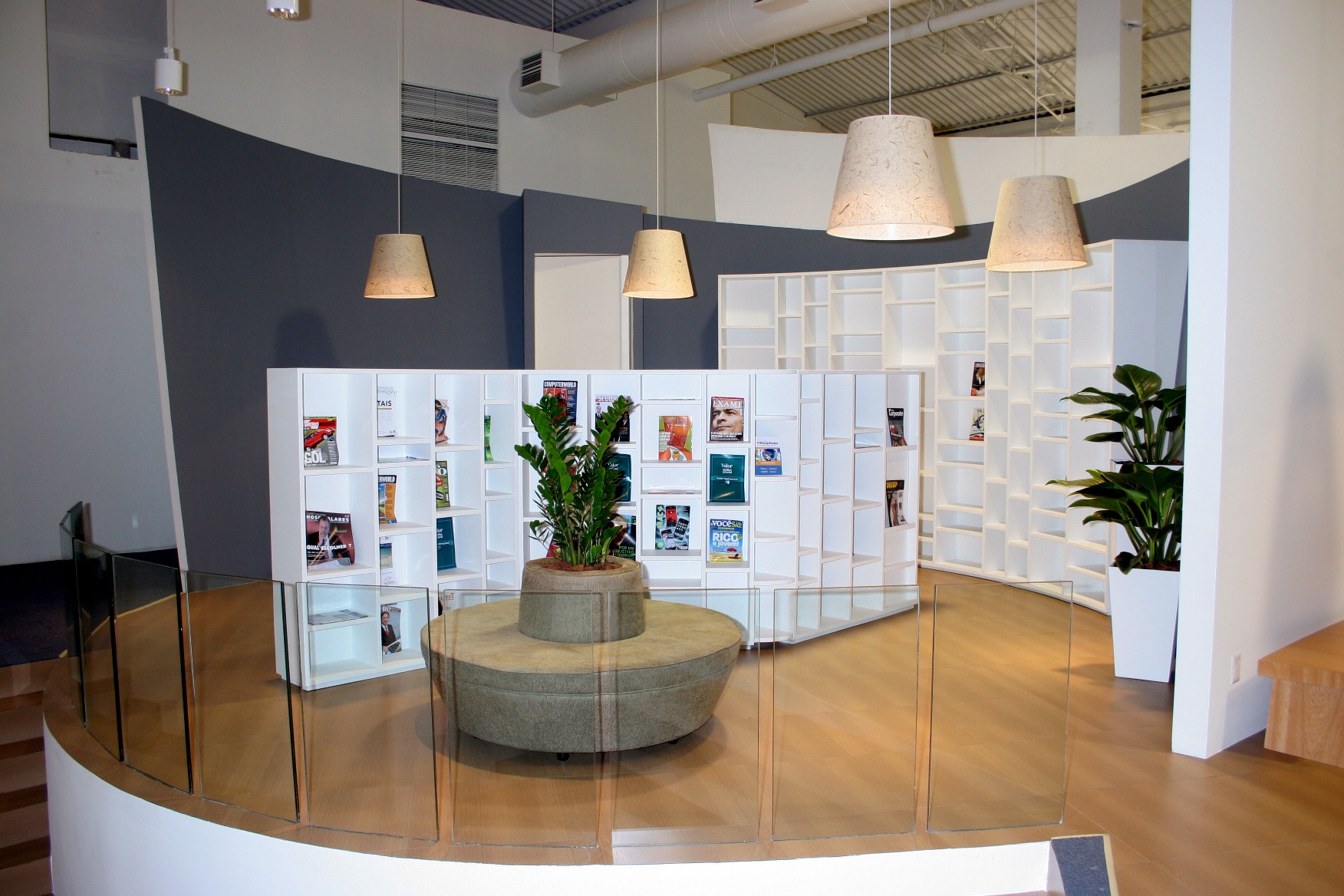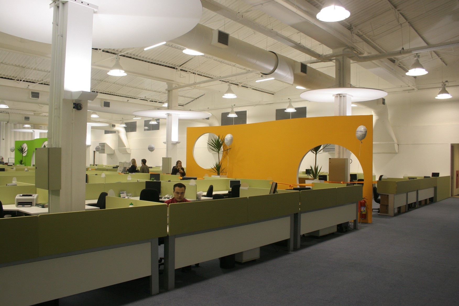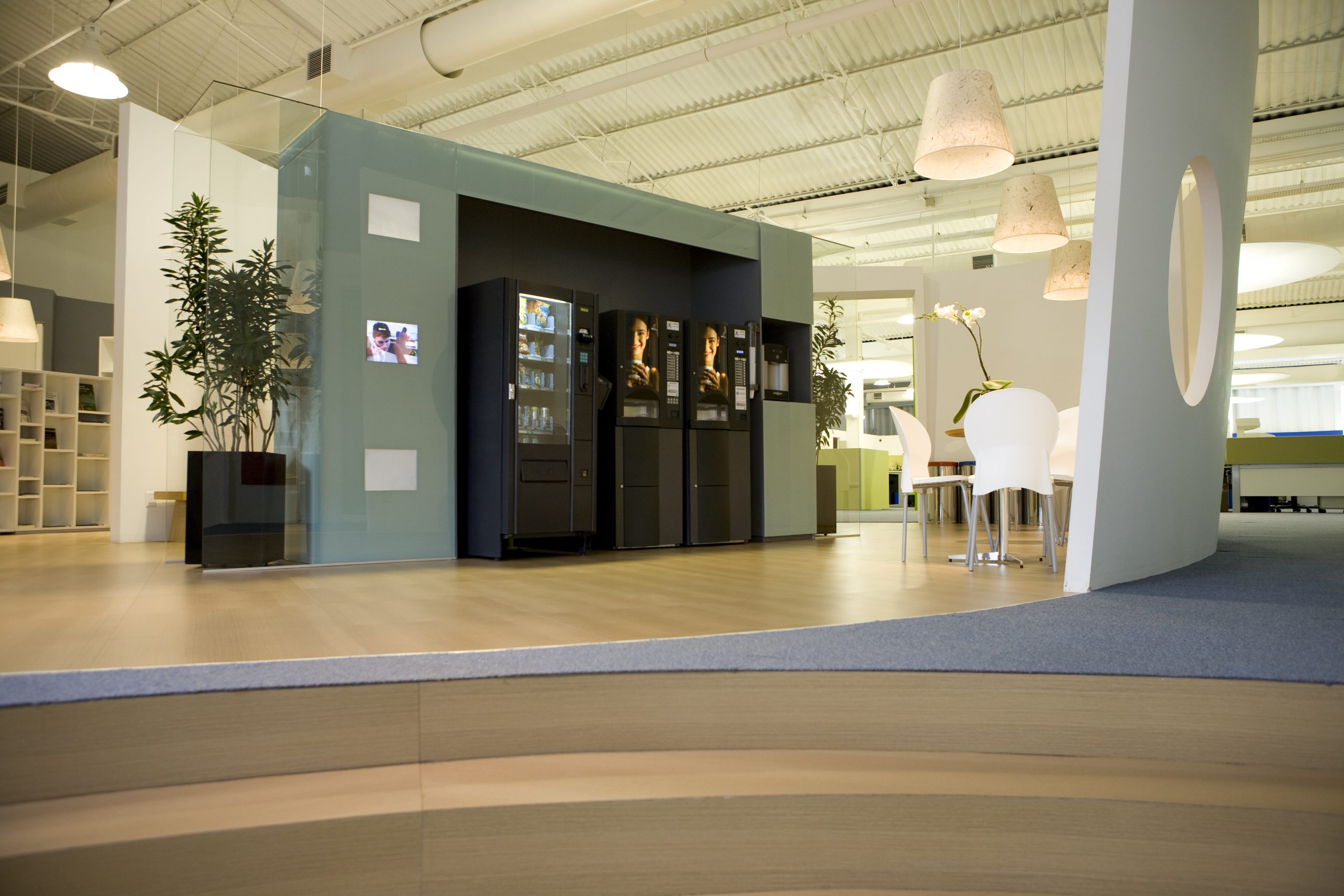A partir dessas divisórias com estrutura metálica, revestimento em placas de gesso e recortes circulares no centro, os ambientes se sucedem – lounge, café, lanchonete, auditório, CPD. biblioteca, cybercafé, espera. O layout interno priorizou a chamada área dos colaboradores, que ocupa praticamente todo o espaço, tendo, numa das laterais, as salas de reunião e diretoria. Os corredores ganharam como que ilhas com divisorias curvilineas e arvores. uma forma de amenizar a rigidez do espaço de trabalho. Toda a madeira do mobilia rio é certicada com o selo verde. A sustentabilidade sempre presente nos projetos