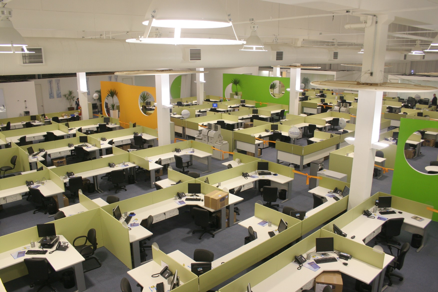 Outra solução para baratear reforma foi o revestimento do piso elevado que embute toda a fiação do escritório com placas de carpete reutilizadas de uma instituição bancária.