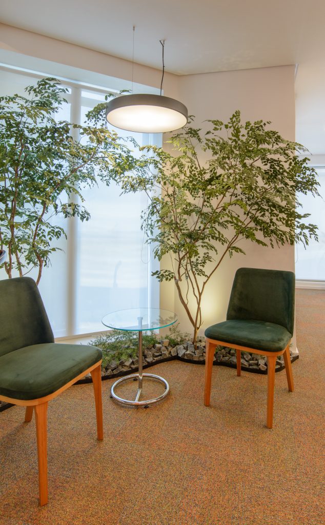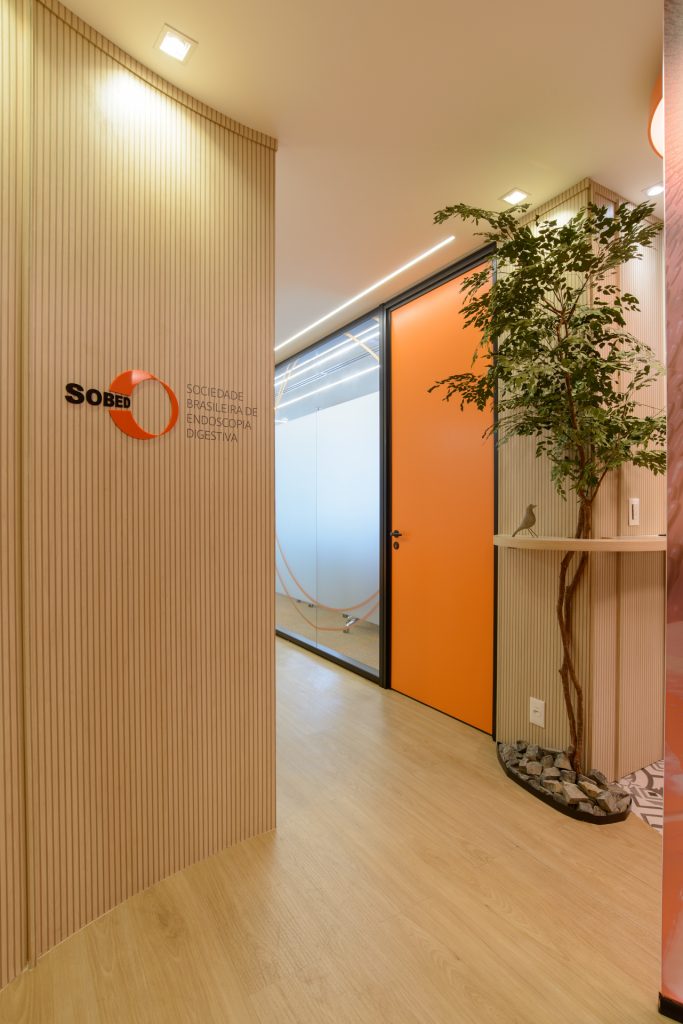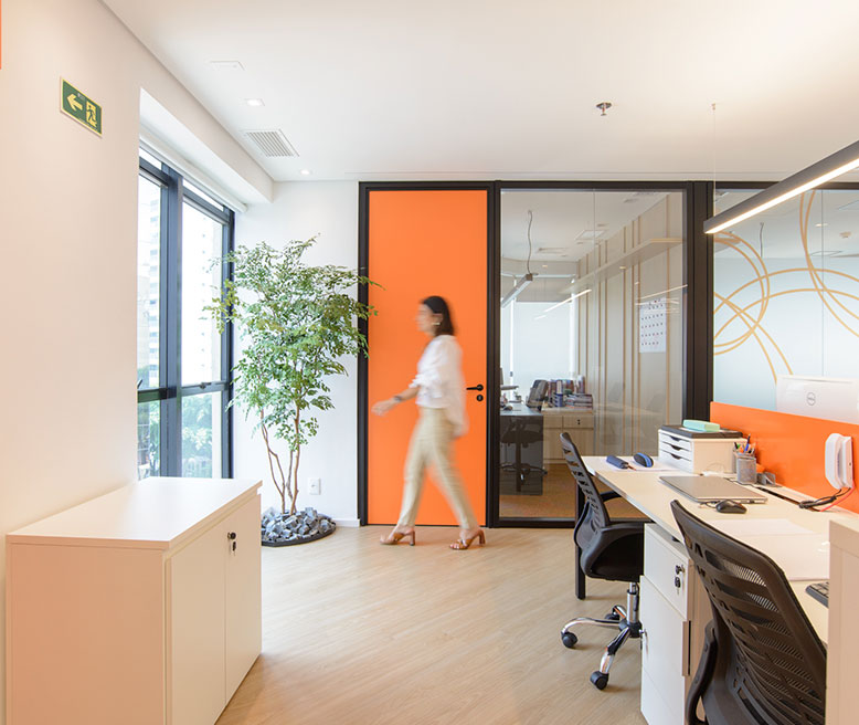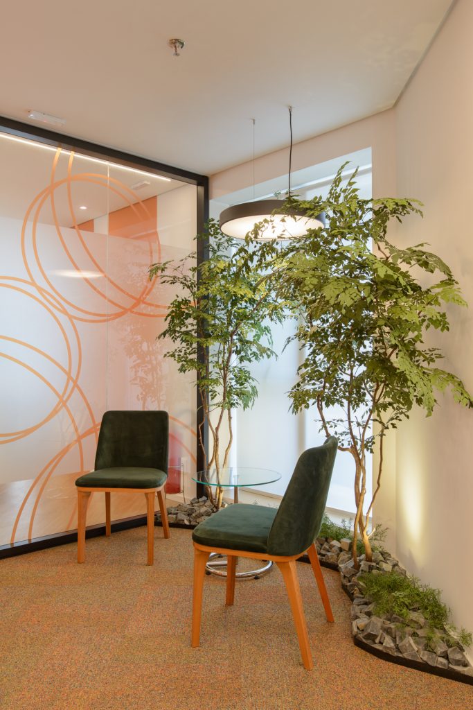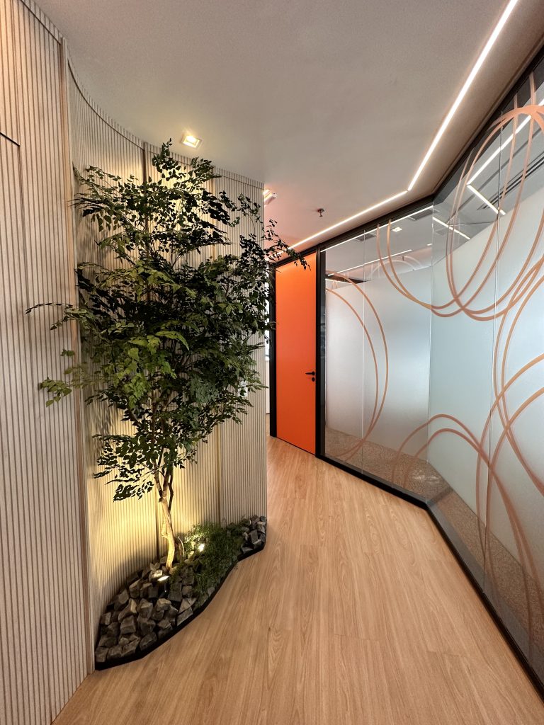 2022 – 500m²Espaços abertos, amplos e com uso de biofilia estrategicamente pensada, para manter sempre um clima agradável e gentil ao ambiente. Na área dos colaboradores foram criados armarios piso teto como divisorias para dividir os ambientes e aproveitando espaço para armazenamento.