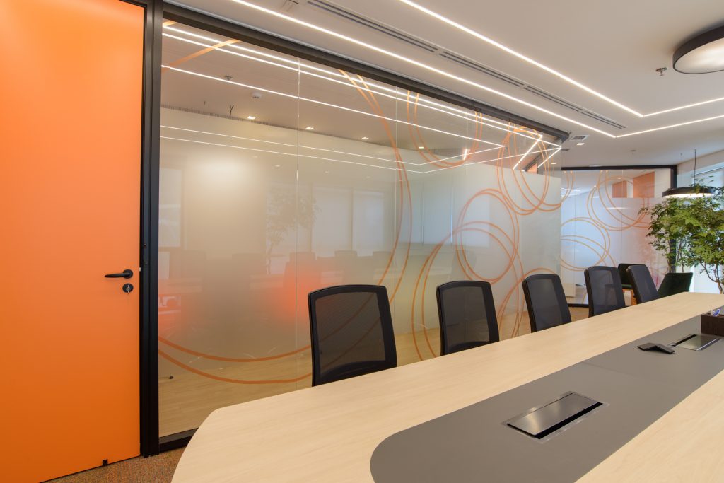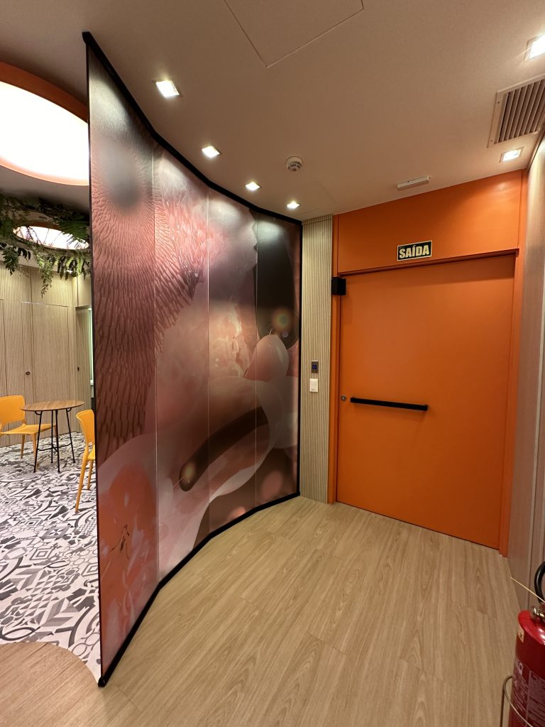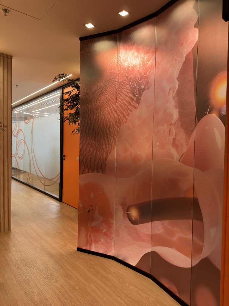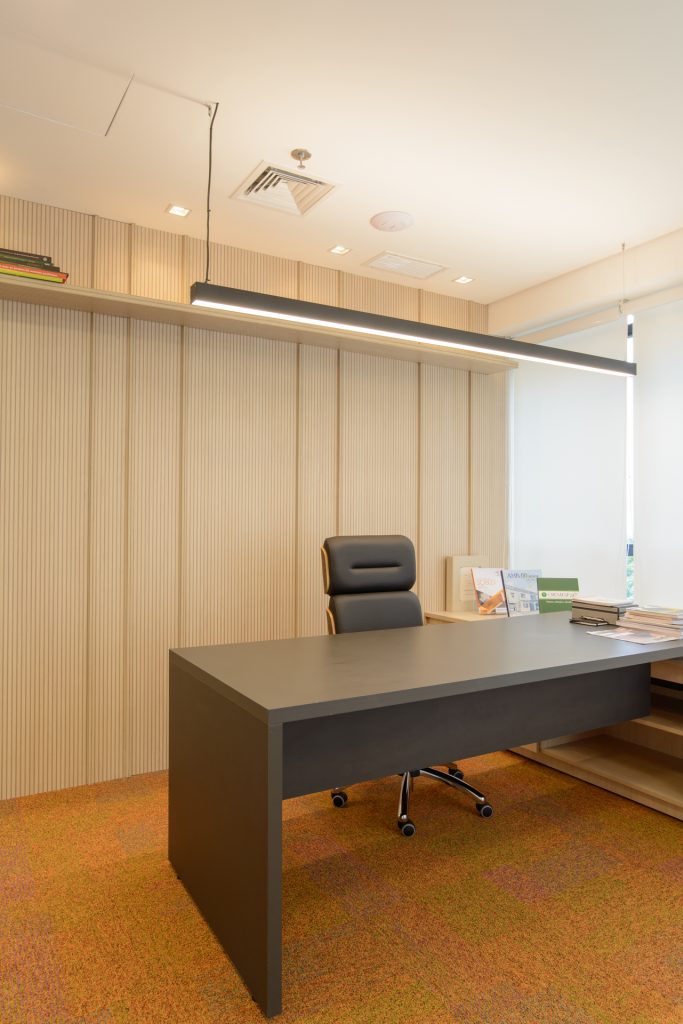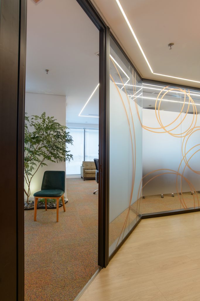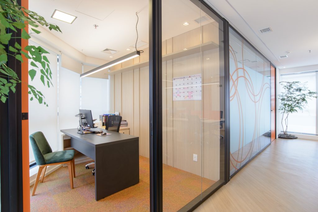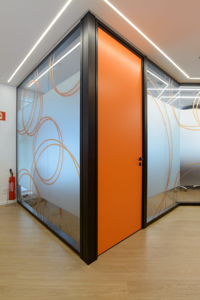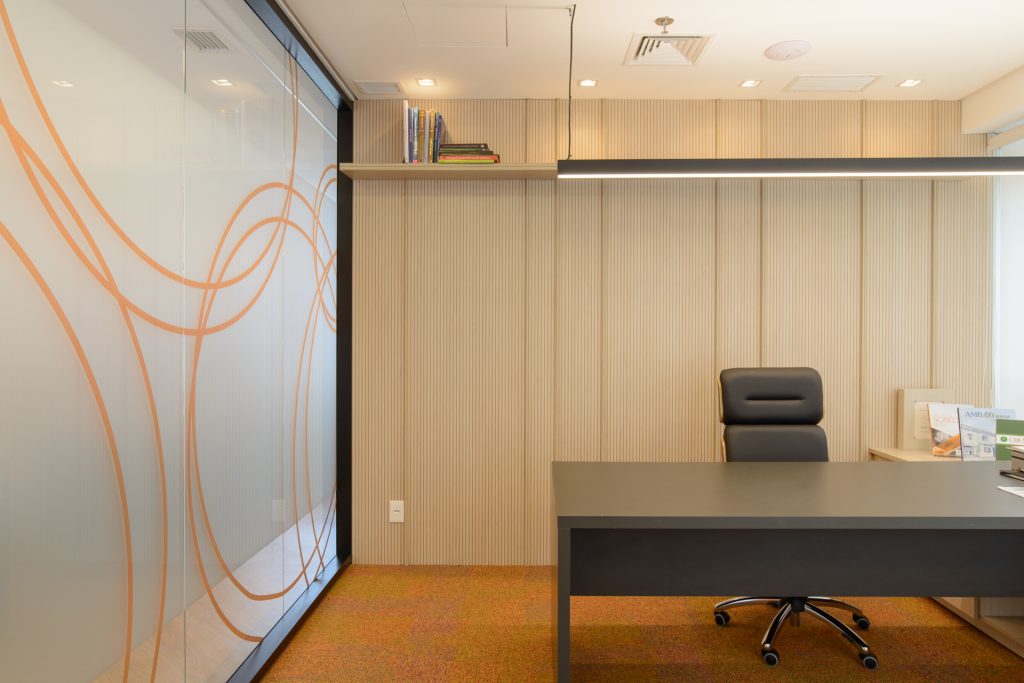 A sala da gerência segue as mesmas características dos outros espaços, contudo, na divisória de vidro, optamos por não instalar arte, atendendo ao desejo da gerente de manter uma visão direta dos colaboradores.