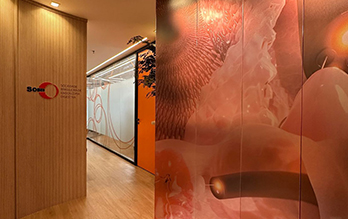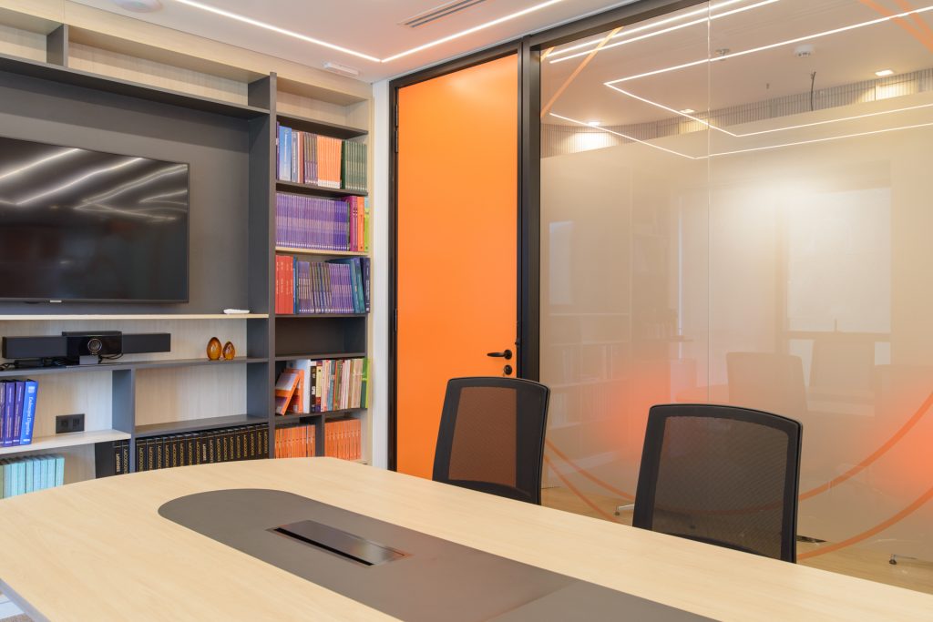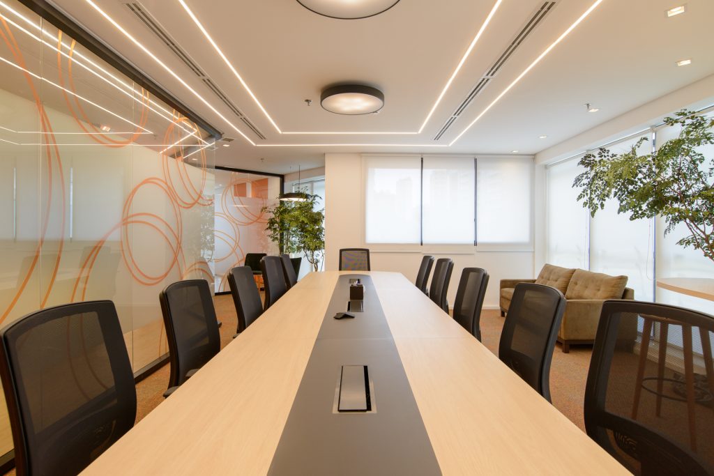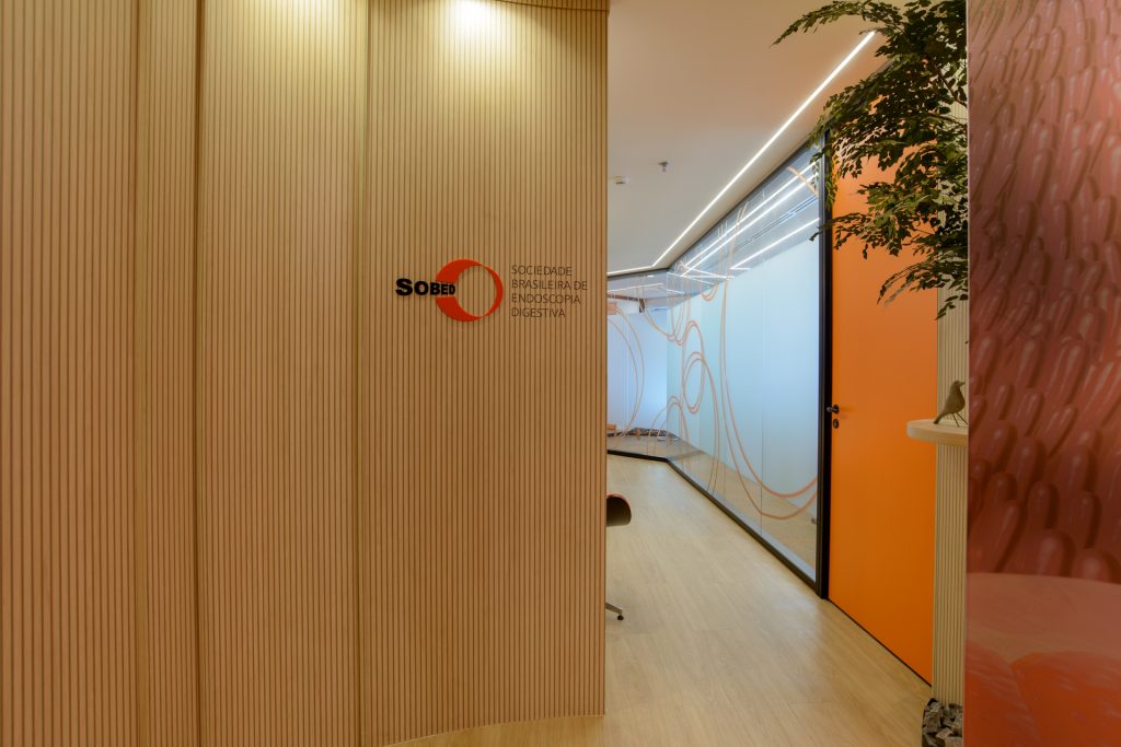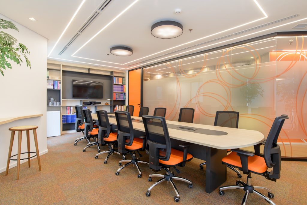 A sala de reunião principal foi concebida para acomodar 14 pessoas, equipada com tecnologia de multimídia de áudio e vídeo para facilitar a comunicação entre médicos de todo o Brasil.