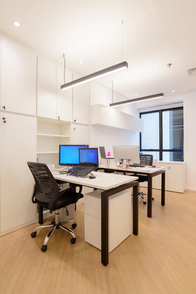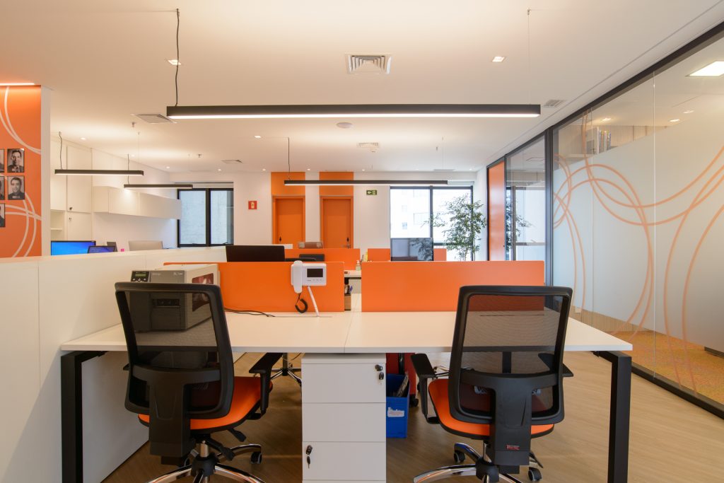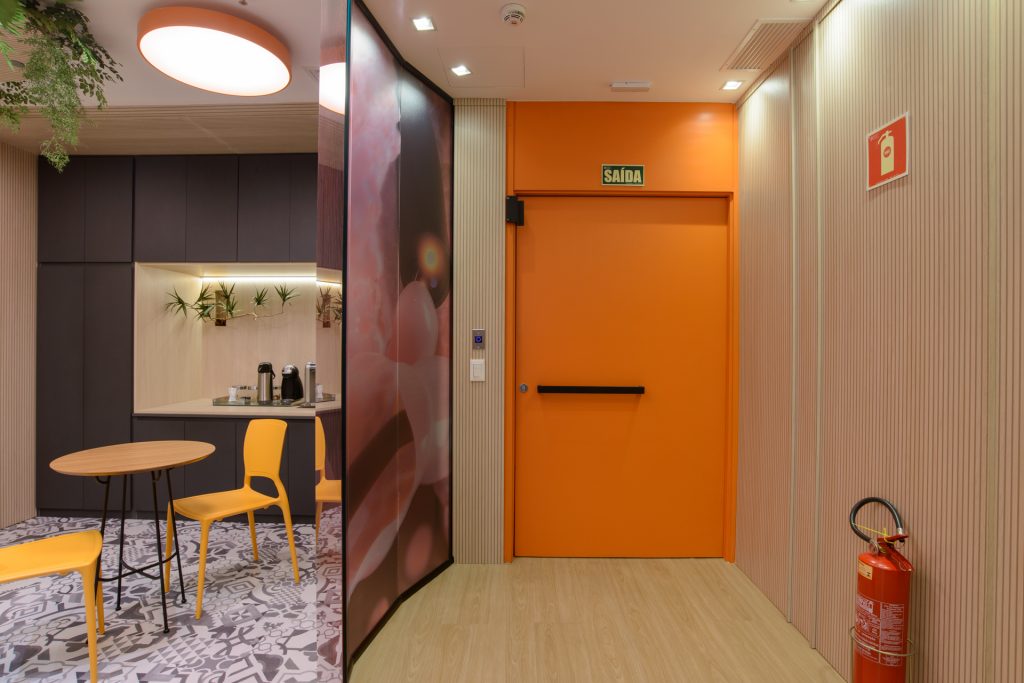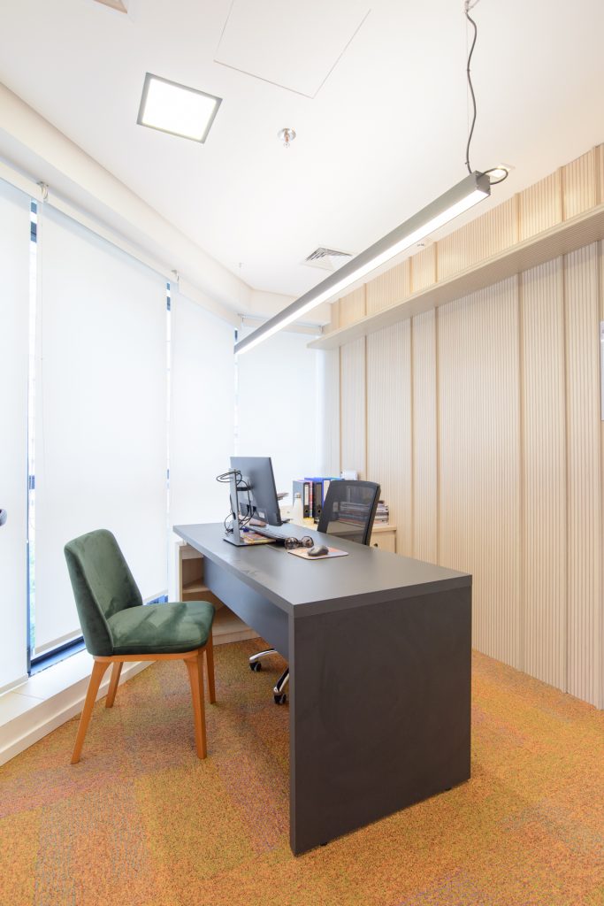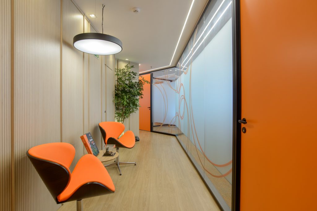 A transformação no ambiente dos colaboradores representa uma significativa mudança neste escritório, que anteriormente era caracterizado por salas fechadas e espaços sinuosos devido à disposição angular da planta baixa, resultando em ambientes mais escuros. Agora, a abordagem adotada é de espaços abertos, amplos e modernos.
