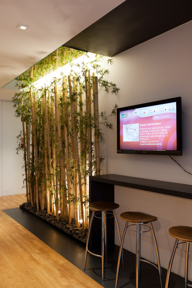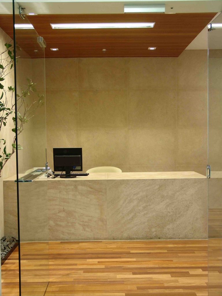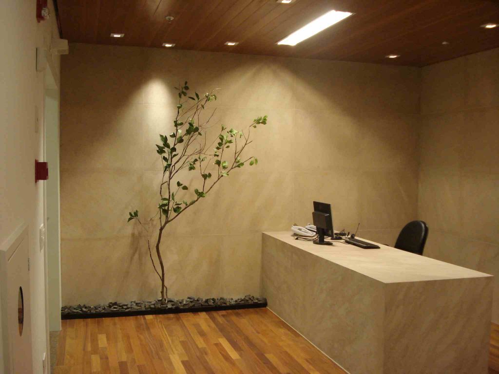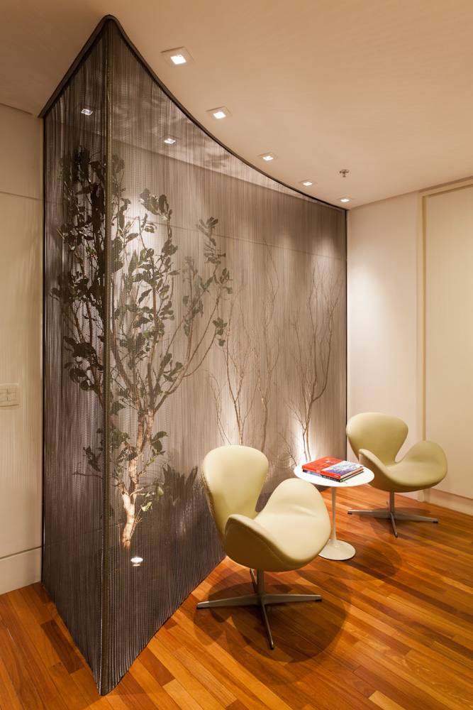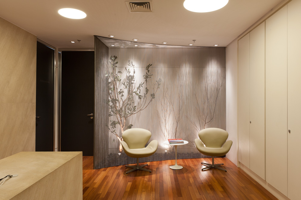“Na recepção foi instalada uma cortina de malha de aço, que tem uma trama aberta, trazendo um efeito muito interessante com as plantas iluminadas atrás dela. A iluminação diferenciada dá um efeito de claraboias de luz natural. As paredes e o balcão são de limestone, que faz um contraponto interessante com o chão e o forro de madeira cumaru natural.”