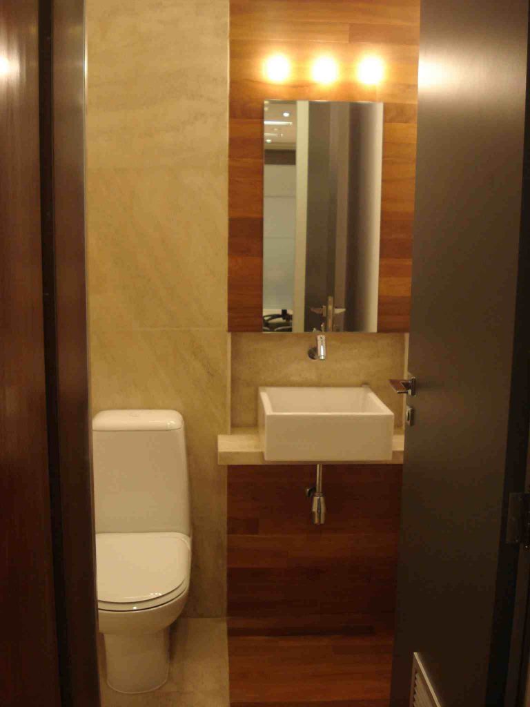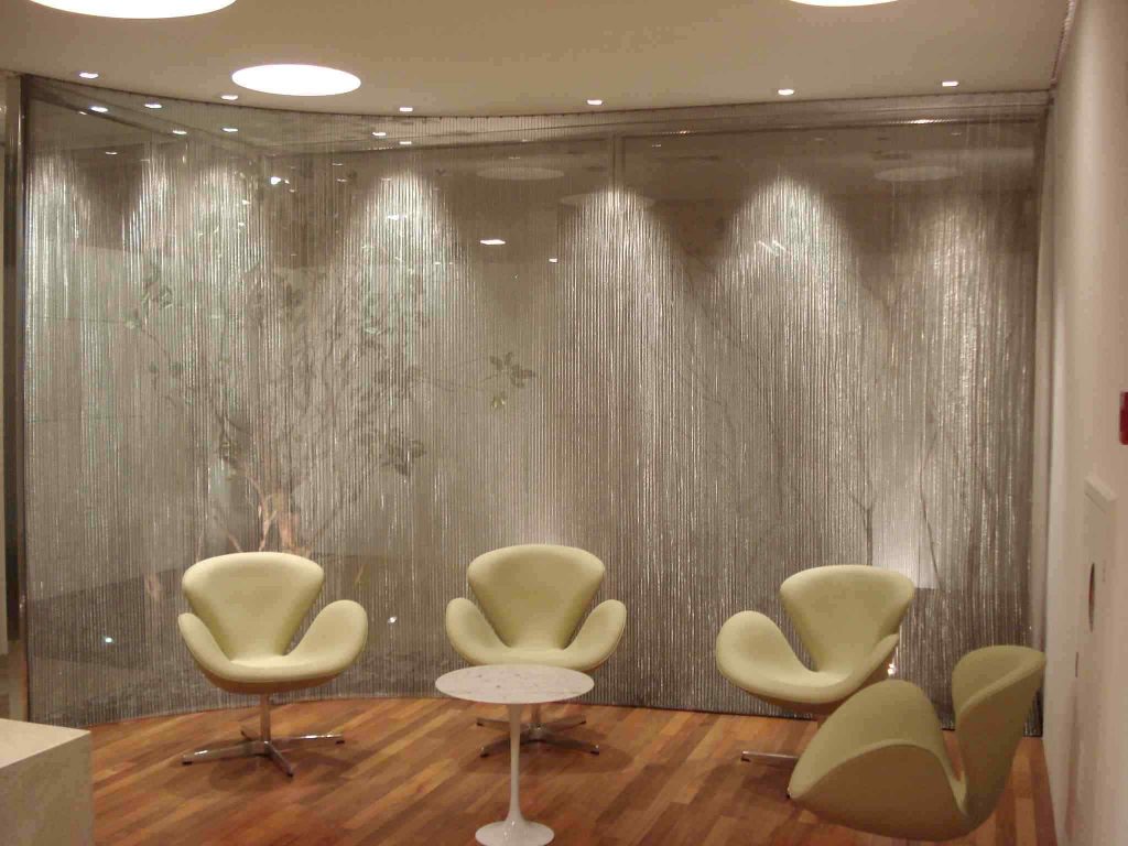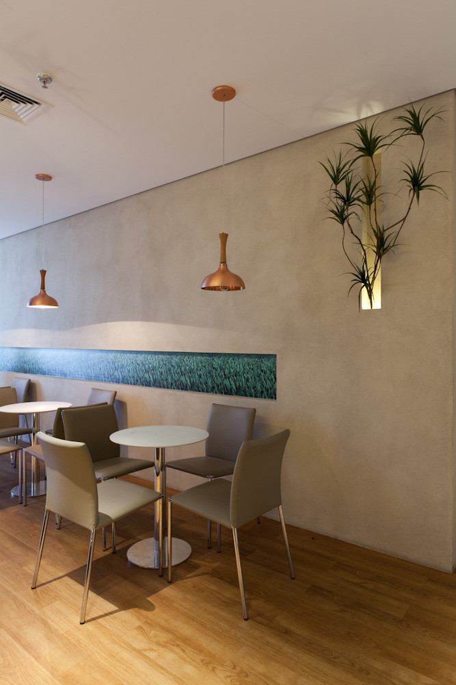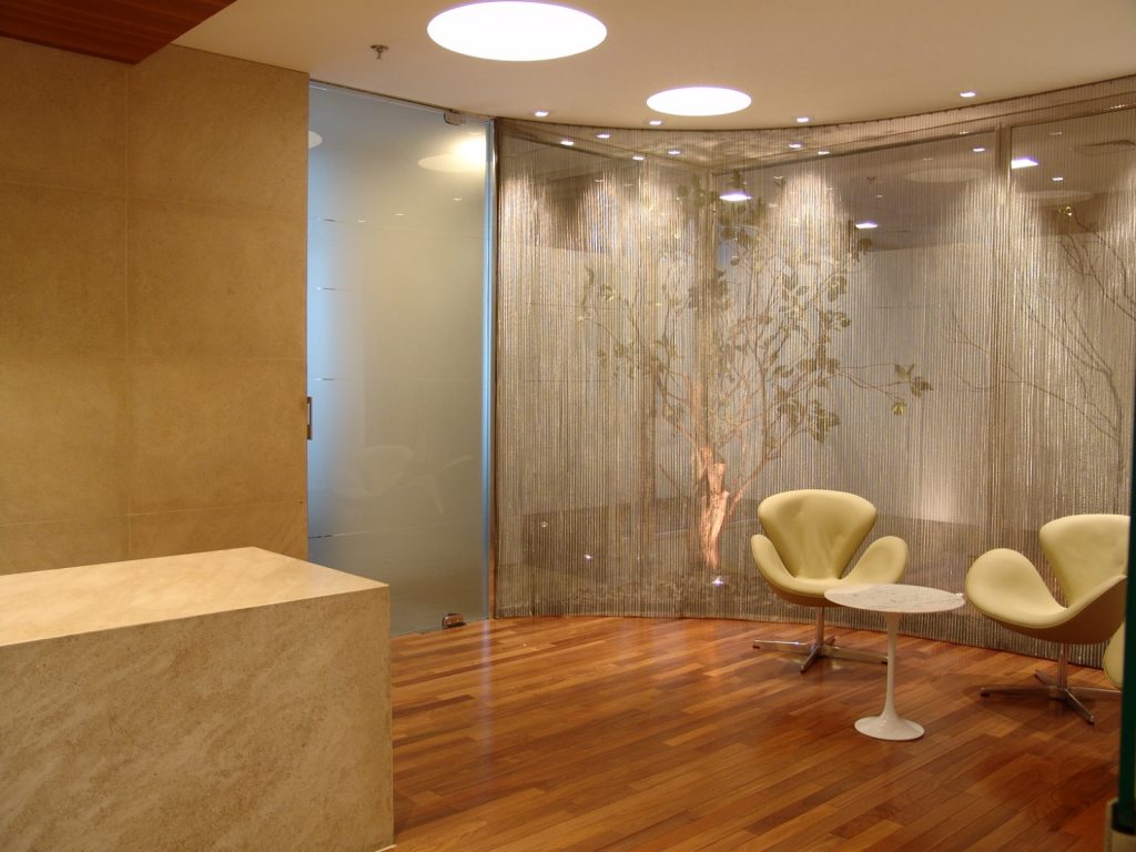 “Na recepção foi instalada uma cortina de malha de aço, que tem uma trama aberta, trazendo um efeito muito interessante com as plantas iluminadas atrás dela. A iluminação diferenciada dá um efeito de claraboias de luz natural. As paredes e o balcão são de limestone, que faz um contraponto interessante com o chão e o forro de madeira cumaru natural.”