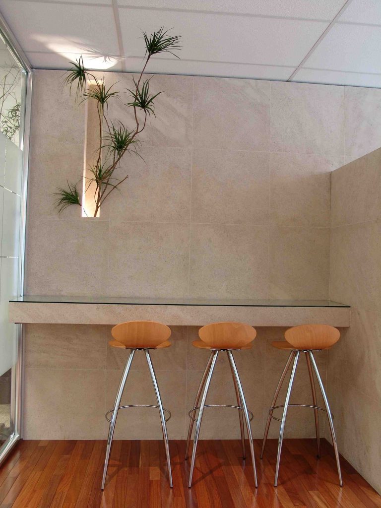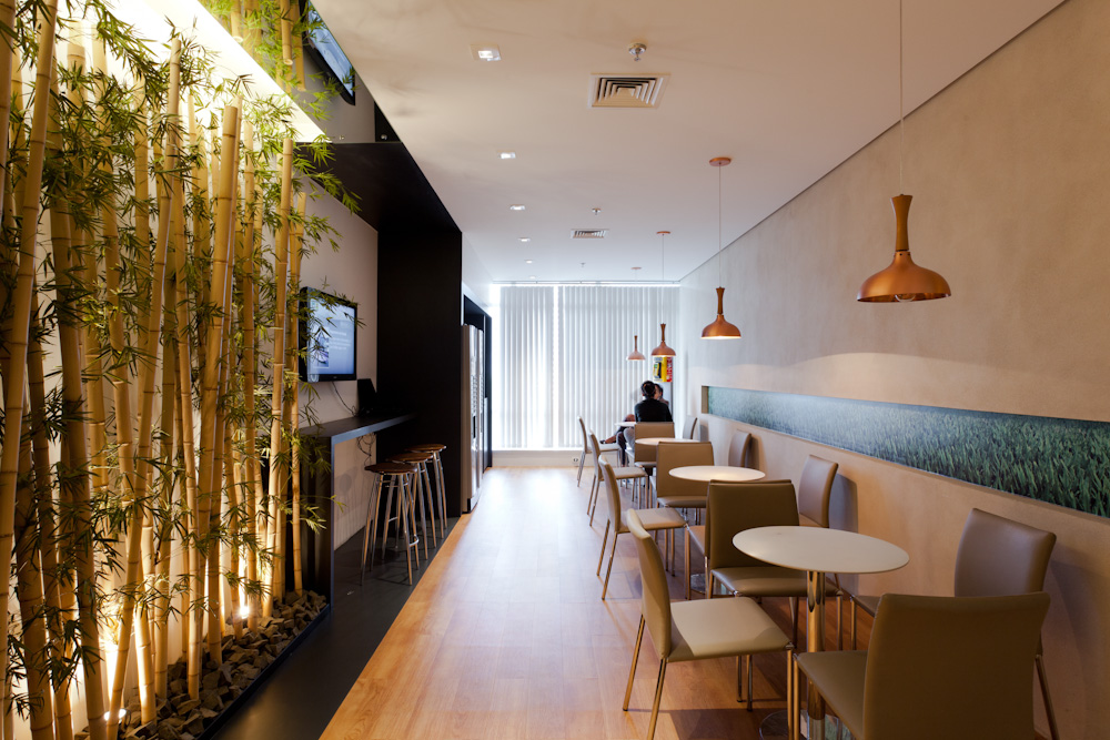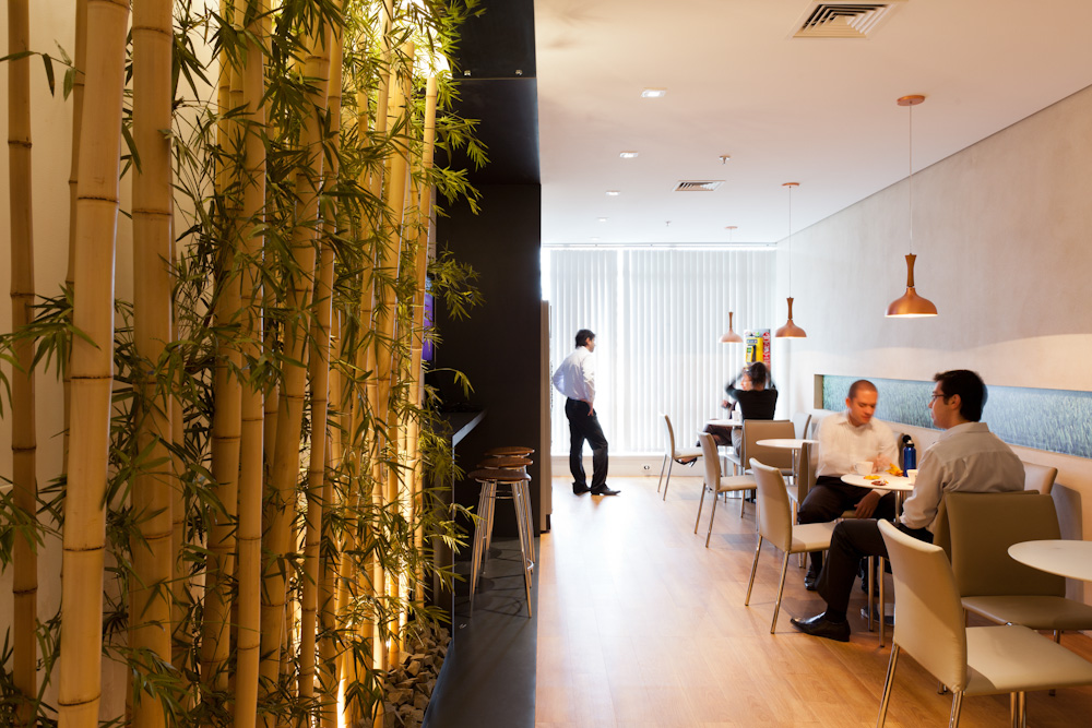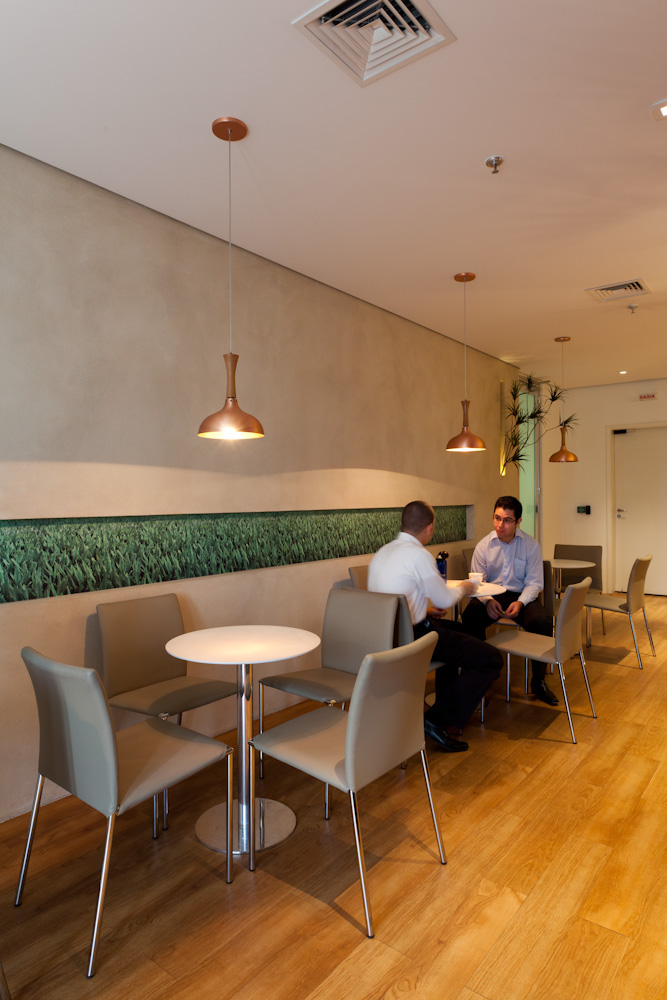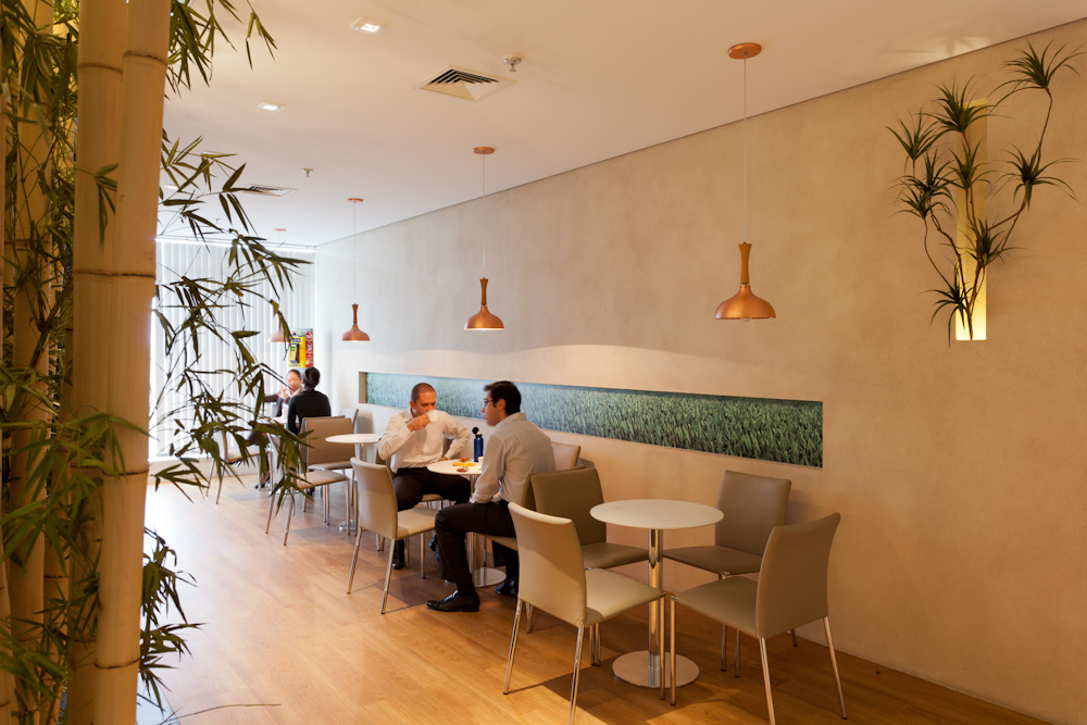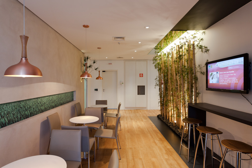 “Nesta obra, reuniu funcionalidade e qualidade com criatividade. A forte presença da vegetação é um ponto forte que ‘humaniza’ o espaço corporativo, tornando o ambiente mais aconchegante. A tecnologia aliada a materiais de muita qualidade, preocupação acústica e estética, criou um ambiente de cores neutras, porém com formas e detalhes que ‘quebram’ esta monotonia de um espaço de trabalho”, contam as responsáveis pelo projeto.